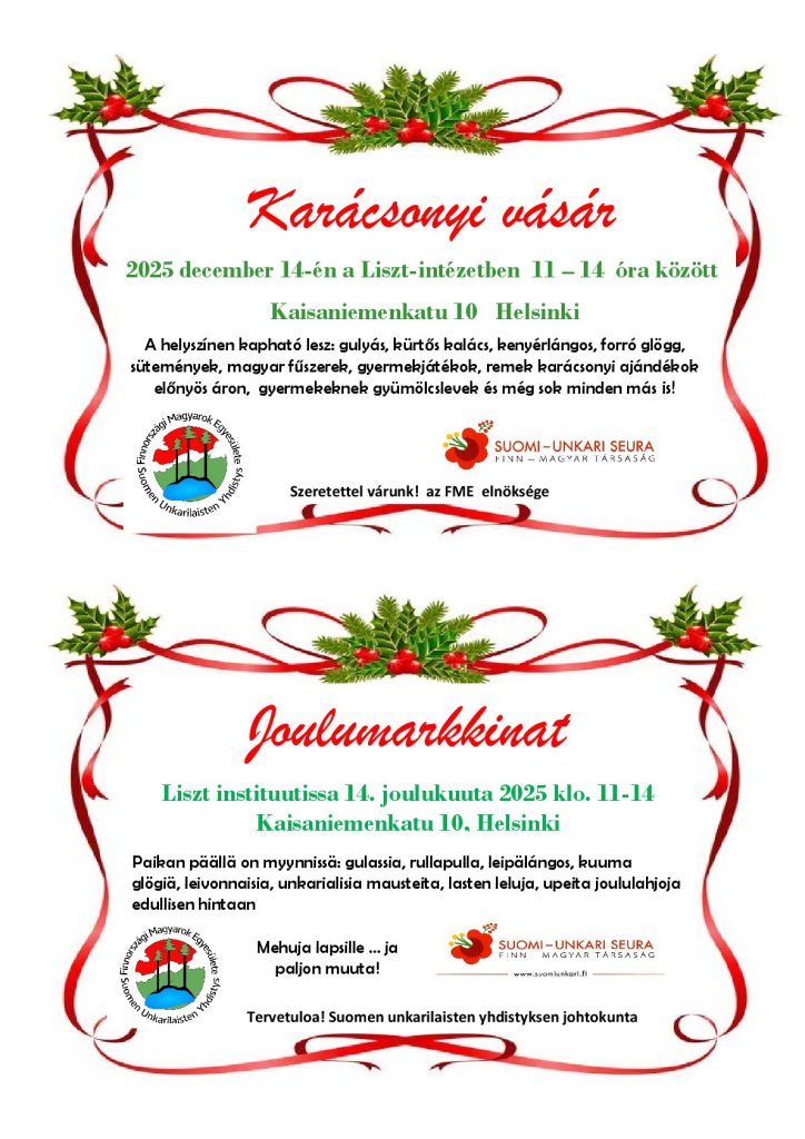 2025.december 14-én, 11 és 14 óra között került megrendezésre a karácsonyi vásárunk, helsinki Liszt Intézetben. A látogatókat igazi magyar ízek és hangulat várta: gulyás, kürtőskalács, kenyérlángos, forró glögg, sütemények, magyar fűszerek, gyermekjátékok, valamint remek karácsonyi ajándékok kedvező áron.